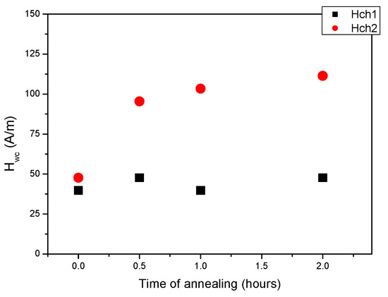 Hcw is the minimum mean external magnetic field, which is necessary to move the domain walls irreversibly from their original position. Hcw is the half-width of minor coercive loops (CL). These loops are measured in the H external magnetic field, which is applied parallel to the easy axis of the sample. The sample should be demagnetized carefully before the measurement. The coercive force, determined from the major hysteresis loop, was found usually significantly larger than the domain wall coercive field [58]. This Hcw, determined from the minor loops, is the true characteristic of domain-wall defect interaction. It characterizes the behavior of domain walls: the local jumps of short domain wall segments between imperfections [59] are averaged.