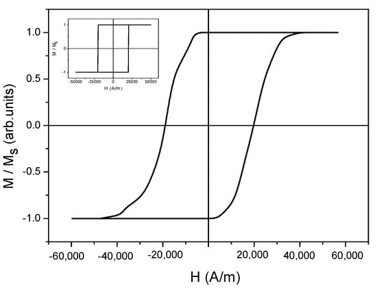 - Vértesy, G.; Pardavi-Horváth, M. Measurement of switching field reduction of single domain particles in a two-dimensional array. Phys. B 2001, 306, 251. [Google Scholar] [CrossRef]