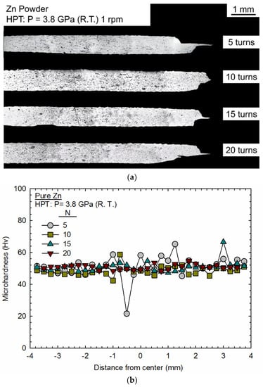 (a) Longitudinal sections and (b) hardness distribution in samples of pure Zn consolidated with HPT using a different number of turns.