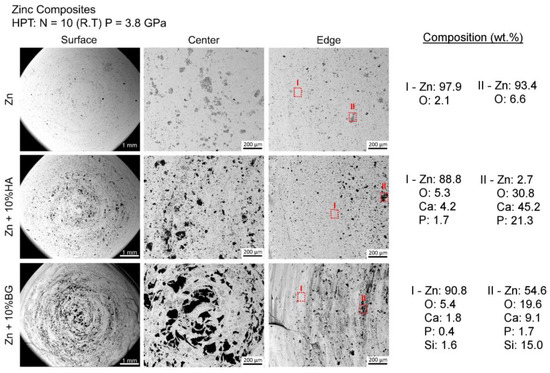 The surface of the discs of pure Zn, Zn-10% HA and Zn-10% BG consolidated with HPT is depicted in Figure 2. A continuous matrix and isolated islands of the second phase are observed in all samples. Details of the edge and center areas are also shown, revealing differences in the size of the reinforcement phase. The reinforcement phase particles appear larger in the center of the discs and smaller near the edges. This is attributed to the difference in shear strain imposed in these areas. The larger shear strain imposed on the edges of the discs can break these particles and promote better mixing with the metallic matrix. However, some cracks are visible near the edges of the Zn-BG composite.