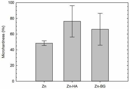 It is then interesting to compare the data of the Zn-HA and Zn-BG composites produced in the present study with other Zn matrix composites and this is provided in data summarized in Table 3. It is observed that the strength of the composites produced in the present study is in the upper range of pure Zn matrix composites. Higher strength is attained in composites in which Zn alloyed with Mg is used in the matrix [52,53]. The corrosion rates of the Zn-HA and Zn-BG composites are also in the upper range for the different composites. It has been shown that the addition of HA increases the corrosion rate and it was suggested that this effect could be used to adjust the degradation of Zn [21]. Data for Zn-BG composites were not found in the literature, but the present results suggest that bioactive glass leads to a similar effect relative to hydroxyapatite. The chemical and biological stability of HA is higher than the BG, therefore the glass can increase the strength but also the corrosion rate [54].