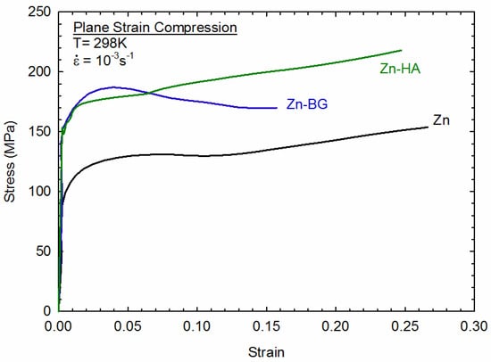 Plane strain compression tests also confirm the higher strength of the Zn-HA and Zn-BG composites. Figure 4 shows the stress vs. strain curves obtained in this test. Thus, the yield stress for the consolidated Zn is ~100 MPa, which agrees with the range of yield stress reported for pure Zn processed with HPT [14]. The flow stress increases to ~160 MPa in the Zn-HA and Zn-BG composites. The Zn-BG composite displays a peak stress of ~180 MPa at a strain of ~0.04, followed by a decrease in flow stress attributed to the propagation of cracks in this material. The consolidated Zn and Zn-HA composite display strain hardening behavior and the flow stress increases with deformation. Flow stress over ~200 MPa is observed in the Zn-HA composite after ~20% strain, which is higher than the peak stress (~150 MPa) observed in pure Zn tested in tension [14]. These results show that the changes in composition and structure due to the incorporation of ceramic particles and HPT processing effectively strengthen the material.