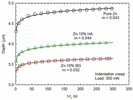 The strain rate sensitivity of the different samples was evaluated using indentation creep tests and following a procedure suggested elsewhere [31]. The indentation depth is plotted as a function of t-tc, where tc is a constant and t is the indentation time (Figure 5). The strain rate sensitivity was estimated for each material and the values are within the range of 0.032~0.044. This range is slightly lower than the values obtained in tensile tests in commercial purity Zn [37]. It is known that the strain rate sensitivity of zinc depends on the testing strain rate [37], temperature and grain size [3,5,38]. It was recently shown that the strain rate sensitivity of metals depends on multiple thermally activated mechanisms [5]. These mechanisms might include grain size strengthening, solution hardening and second phase particle strengthening. Thus, the present results suggest that the strengthening effect due to hard ceramic particles might decrease the strain rate sensitivity of zinc.