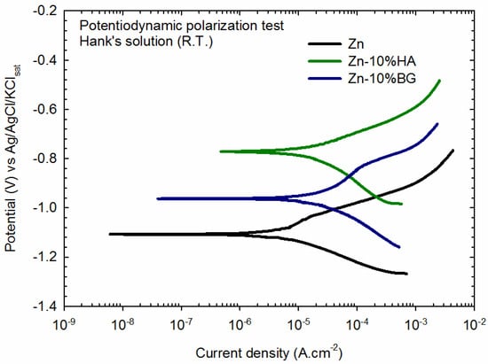 where icorr is the corrosion current density (µA/cm2) extracted from linear fit and Tafel extrapolation for the anodic curve for Zn-10% HA and cathodic curve for Zn and Zn-10% BG, EW is the corresponding equivalent weight and ρ is the density of corroding material (g/cm3). Zinc, hydroxyapatite and bioglass density was 7.13 g/cm3, 3.16 g/cm3 [35] and 2.70 g/cm3 [36], respectively. Some samples were immersed in Hank’s solution for 24 h and the surface was then observed using SEM.