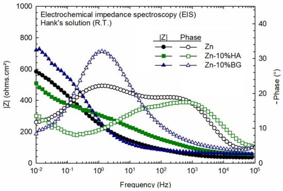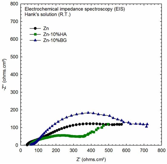 Electrochemical tests were used to evaluate the corrosion behavior of the different materials in the Hank’s solution. Figure 6 shows representative potentiodynamic polarization curves. It is observed that the incorporation of HA and BG increases the corrosion potential of the composite compared to consolidated Zn. It also increases the corrosion current and the values determined in experiments are given in Table 1. It is observed that the corrosion current density in consolidated pure Zn agrees with the value of 9.07 μA/cm2 reported for rolled pure Zn [39]. Compared to the pure Zn sample, the increase in corrosion current density in the Zn-HA composite also agrees with the trend reported in the literature [21]. The curves of the EIS tests are shown in Figure 7 and Figure 8. The electrochemical impedance spectroscopy (EIS) test shows a decrease in impedance in the Zn-HA composite compared to Zn and an increase in this parameter in the Zn-BG composite. A decrease in impedance was also reported for a Zn-HA composite compared to pure Zn [21]. In Figure 8, it can be observed that the impedance modulus at a frequency of 10−2 Hz is higher for the Zn-BG composite. The shape of the frequency versus phase angle curves indicates two-time constants for pure Zn and the Zn-HA composite and a one-time constant for the Zn-BG composite, which suggests different corrosion mechanisms.