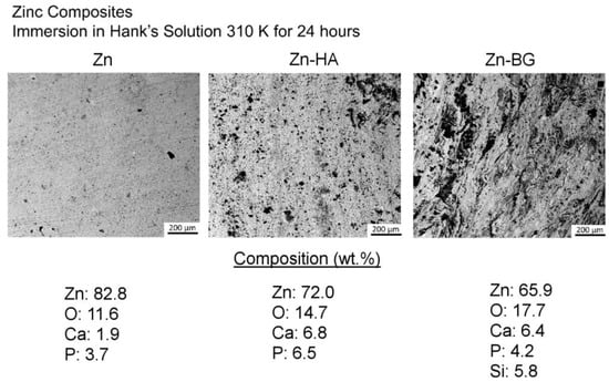 The different samples were subjected to immersion in the Hank’s solution for 24 h and their surfaces were observed using SEM. Figure 9 shows the appearance of the different samples. Pure Zn shows no sign of significant corrosion, while a rougher surface develops in the Zn-BG composite, suggesting more corrosion in the latter. The average composition of a large area was evaluated using EDS and the results show the presence of O and minor amounts of Ca and P in the consolidated Zn. The amount of O, Ca and P is larger in the Zn-HA and Zn-BG composites, and could reach higher levels of the Ca/P ratio if it stays in the solution for a longer period, confirming these composites’ ability to develop a surface layer rich in these elements. An increase in O, Ca and P concentration was reported for the surface layer of a Zn-10% HA composite compared to a pure Zn counterpart after 50 days of immersion in a Hank’s solution [21]. The following was also reported: an increase in the ratio of Ca/P from 0.54 in pure Zn to 1.41 in the Zn-HA composite [21]. This trend agrees with the present results, showing a ratio of 0.51 in pure Zn and 1.05 in the Zn-HA composite.