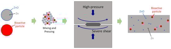 The present results show it is possible to consolidate Zn particles into a bulk through HPT processing. The large compressive stresses and severe shear straining promotes the elongation of particles, breaking the oxide layer and enabling metal binding. It is also shown that the ZnO particles become dispersed within the matrix during consolidation. Incorporating bioactive particles is also possible and the results show that the breaking and dispersion of these particles increase with increasing straining during HPT. Thus, the particles become smaller and better dispersed at the edges of discs processed using 10 turns of HPT compared to the center of these discs. The effectiveness of the consolidation is verified by the enhanced mechanical strength of the composites. It is expected that the heterogeneity in the disc structure from the center to edge will decrease with increasing the number of turns of HPT [8]. Moreover, eventual differences in the structure are avoided when processing ring samples [40,41,42] instead of disc-shaped samples. Figure 10 illustrates the procedure and the final structure of the composites. Thus, the initial Zn and bioactive particles are mixed, pressed and consolidated using high-pressure torsion. The final structure can be described as a continuous matrix of Zn containing dispersed ZnO and bioactive particles.