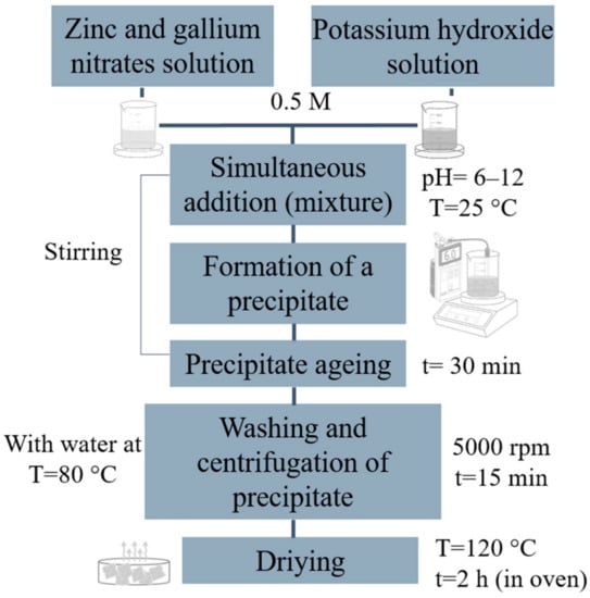 The materials were synthesized through a soft aqueous coprecipitation method at room temperature [] following the procedure shown in Figure 1. Initially, zinc nitrate and gallium nitrate were dissolved in decarbonated, deionized, and distilled water to obtain a 0.5 Zn/Ga molar ratio precursor solution. A 0.5 M KOH aqueous solution was prepared as precipitant, then specific volumes of the previous solutions were mixed until the pH of the reaction medium reached values of 6, 8, 10, and 12. Afterwards, the mixture was aged at room temperature for 30 min under magnetic stirring. Finally, the obtained precipitate was washed with hot water (80 °C), centrifuged at 5000 rpm for 15 min, and dried in air at 120 °C for 2 h. The samples were labelled as S6, S8, S10, and S12, where the numbers represent the pH value employed during synthesis.