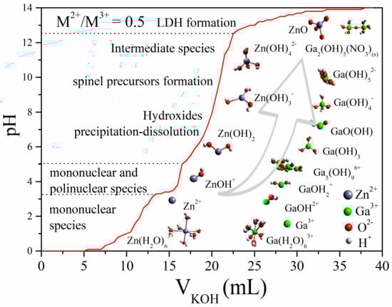 It is widely recognized that a titration study must be conducted to identify precipitation and coprecipitation zones of metallic cations [,,]. The titration curve of the Zn-Ga precursor solution using KOH as precipitant agent is presented in Figure 3. From this, four sections were identified: 0–3.2, 3.2–5.0, 5.0–11.4, and 11.4–14.0. At the pH interval between 0 and 3.2, different complexes such as Zn(H2O)62+, Ga(H2O)63+ and GaOH2+ coexist in the aqueous media. Subsequently, it has been reported that mononuclear and polynuclear species such as ZnOH+, Ga(OH)2+, and Ga5(OH)96+ can be found in the pH range between 3.2–5.0, with precipitation of amorphous Ga(OH)3(s) beginning simultaneously []. A slope change is clearly visualized at pH 5.0 and continues until around 11.4. Accordingly, it has been reported that individual gallium or zinc species such as Ga(OH)3(s) [] and GaO(OH) [] form, precipitation of Zn(OH)2 occurs, and Zn(OH)2 partial dissolution generates Zn(OH)3− species []. Finally, in the 11.4–14.0 pH interval, the strong alkaline conditions lead to formation of mononuclear species such as Ga(OH)4− and Ga(OH)52− anions [], which are the precursors of the Ga2(OH)5(NO3) solid phase. On the other side, Zn(OH)42− species form from Zn(OH)3− at this pH interval, and Zn(OH)2 re-dissolution takes place []. It is recognized that the precipitation zones of individual metallic salts are distinct from coprecipitation of mixtures of metallic salts. For instance, Ross and Kodama [] carried out a comparison between the precipitation of Mg(OH)2 from MgCl2 and MgCl2/AlCl3 solutions using NaOH as precipitant agent. They observed that Mg(OH)2 precipitated at pH 9.5 from the MgCl2 solution. Conversely, the mixture presented a pH plateau between 7.7 and 8.5 associated with formation of Mg(OH)2. The authors attributed this buffering effect to the interaction between magnesium and aluminum species giving rise to formation of an anionic clay.