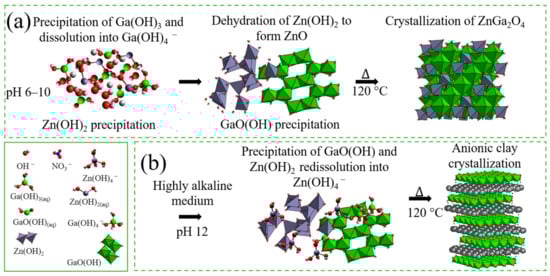 Titration curve analysis and identification of the distinct species is a requirement of a proposed reaction mechanism. In this sense, as the pH is kept constant in each synthesis, the reaction mechanism can be envisaged as a simultaneous coprecipitation-dissolution-crystallization process, where the precursors coprecipitate, then, depending on the species stability, re-dissolve and crystallize in the form of a more stable compound. Figure 4 presents the formation mechanism proposed for ZnGa2O4 and the anionic clay material (Zn-Ga LDH).