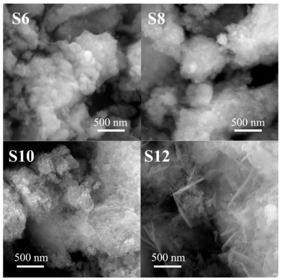 In the case of the S6 sample, irregular agglomerates of particles with hemispherical shape and average size of 78 nm are observed. These particles are associated with the ZnGa2O4 phase. As the pH increases, agglomerates of similar smaller particles continue to be observed; however, their morphology is more irregular. Interestingly, several platy-like particles are identified in the S10 sample. In the micrograph of sample S12, particle agglomerates mixed with platy-like structures with lengths around 380 nm are observed. These elongated structures are associated with the characteristic habit of LDH crystals []. This evidence corroborates the progressive transition of spinel-like structures to LDH phase.