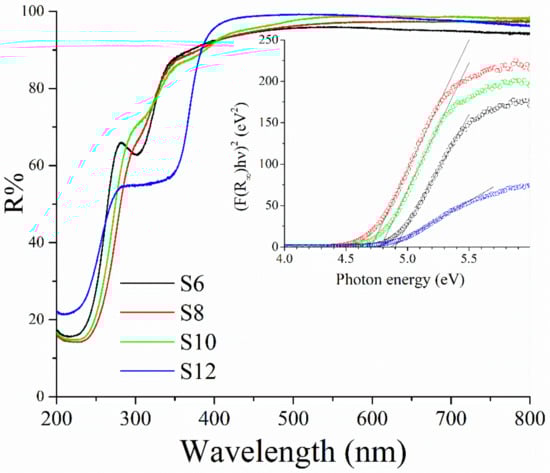 The solid samples were further studied through DRS (see Figure 6). The spectra of all samples present a strong absorption edge around 260 nm, attributed to the electronic band-to-band transition of ZnGa2O4. Excepting S12, a second absorption edge is observed around 330 nm. Because the XRD patterns of samples S6–S10 exhibit only the characteristic ZnGa2O4 reflections, this feature can be attributed to an optical absorbing trace, probably a solid solution formed by diffusion of interstitial Zn2+ ions into the spinel lattice []. Because the absorption edge attributed to zinc gallate is not hidden by the optical absorption of the narrower band gap phase, the latter must be a minority phase, in agreement with the X-Ray patterns. In the case of S12, its spectrum is dominated by an optical absorption edge located around 370 nm, which is attributed to a non-negligible amount of wurtzite ZnO []. The residual reflectance at the shortest wavelength is associated with the Zn-Ga LDH phase, which has a bandgap energy higher than 5.5 eV [,].