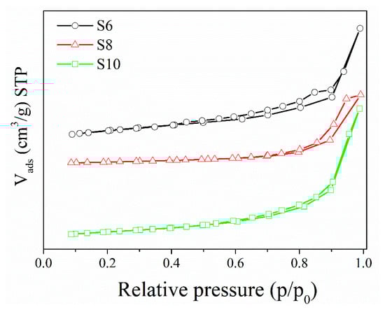 N2 adsorption–desorption isotherms of S6, S8 and S10.