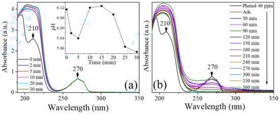 Time evolution of the absorbance spectrum of the phenol solution containing the S6 catalyst under (a) dark conditions (absorption–desorption) and (b) UV irradiation (photocatalysis). Inset: pH changes of the test solution under dark conditions.