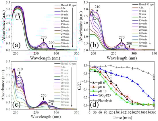 Time evolution of the absorbance spectrum of the aqueous phenol solution using (a) S8, (b) S10, and (c) TiO2-Degussa P25 catalysts. (d) Phenol degradation curves using the samples synthesized at different pH as photocatalysts.