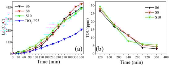 where C0 is the initial phenol concentration, C corresponds to its concentration at time t, and k is the apparent rate constant []. The values of the latter parameter for samples S6, S8, S10, and TiO2-Degussa P25 were determined to be 12.3 × 10−3, 11.9 × 10−3, 11.6 × 10−3, and 4.2 × 10−3 min−1, respectively (see Figure 10a). Because the rate constant k is related to the molar concentration of the reactants, these results suggest rapid degradation of phenol in the presence of S6. Its rate constant is 2.9 times larger than that of TiO2-Degussa P25.