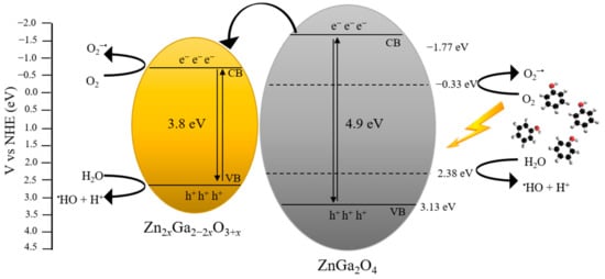 Schematic illustration of the proposed photocatalytic mechanism of Zn2xGa2−2x O3+x/ZnGa2O4.