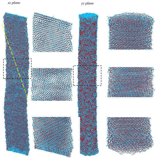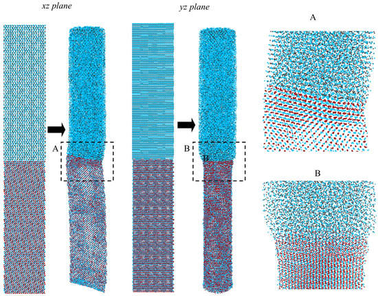 Figure 6 presents the initial and final simulation states of ZnO/CuO nanowires at 200 K. In these, deformations were observed in the “xz” and “yz” planes when compared with the original structure. In the upper and lower parts of the nanowire, the atoms were located similarly to those previously presented for ZnO and CuO. Moreover, the analysis focuses on the deformations around the junction. The segment labeled A and B in Figure 6 show a higher level of deformation of the ZnO regions compared with CuO, where even the cylindrical deformation at the end of CuO, due to the constriction effect on the slip planes, is also observed in the interface.