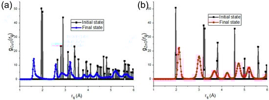 Radial distribution function in the initial and final state for nanowires of (a) CuO and (b) ZnO.