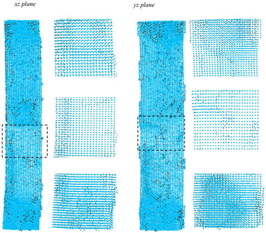 The final state of CuO nanowires after relaxation at 200 K. The boxes on the dotted line exist to identify the zoom represented on the right in both the “xz” and “yz” planes. The red line represents a crystalline plane, whose connections with the surface coincide with the maximum and minimum waviness of the nanowire.