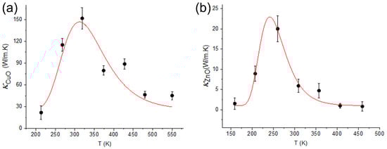 Thermal conductivity as a function of temperature for nanowires of (a) CuO and (b) ZnO. Different systems were built at each temperature. The red line is a visual guide.