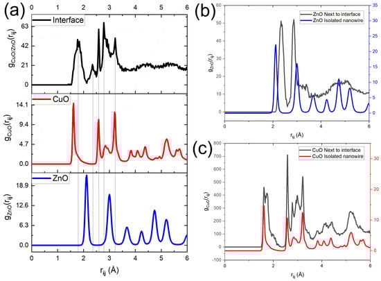 Figure 7a presents a characterization of the interface using the radial distribution. The previous RDFs of the CuO and ZnO nanowires have been located below for comparative analysis. As can be seen, the peak located at 3.5 Å disappears, demonstrating a high degree of amorphicity. Additionally, peaks at distances below this value have not been shown to be consistent with CuO and ZnO. In particular, the peak corresponding to the first neighbors appears at an intermediate point concerning CuO and ZnO. This result seems to agree with previous research, where good adhesion of CuO nanoparticles on ZnO nanowires was reported [].