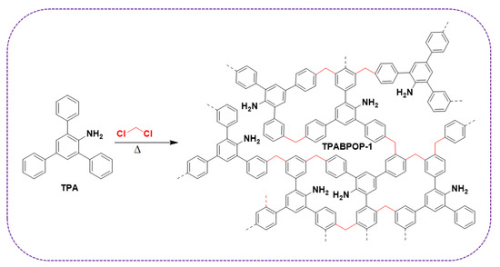 Triphenylaniline-based porous organic polymers (TPABPOP-1) were synthesized by the Friedel–Crafts reaction. Under a nitrogen atmosphere, 2,4,6-triphenylaniline (0.50 g, 1.56 mmol) was added to DCM (10 mL), then it was stirred for 10 min; next, anhydrous AlCl3 (5.00 g, 37.33 mmol) was added. After that, the mixture was reacted at RT for 1 h, followed by vigorous stirring for 8 h at 30 °C; for 12 h at 60 °C; and for 12 h at 80 °C. The mixture was cooled at ambient temperature, then the obtained precipitate was quenched using 15 mL HCl: H2O (0.5:1(V/V)), then washed with water and methanol, respectively. Finally, the polymer (TPABPOP-1) was dried in a vacuum oven for 24 h at 65 °C (Figure 1).
