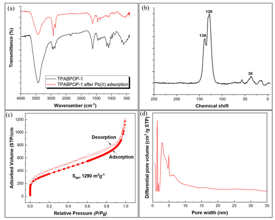 (a) FTIR spectra of TPABPOP−1 and TPABPOP−1/Pb(II), (b) 13C CP/MAS NMR, (c) N2 adsorption–desorption isotherm, and (d) pore size distribution of TPABPOP−1.