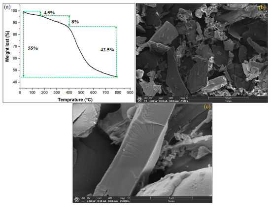 The thermal stability of TPABPOP-1 is shown in Figure 3a. The initially small weight loss (4%) in the range of 30–150 °C was due to the release of entrapped solvent and water from the pores of TPABPOP-1 [37]. At 365 °C, the mass of the TPABPOP-1 decreased by 8% due to the initial breakdown of the TPABPOP-1’s structure. Up to about 800 °C, the weight loss of the TPABPOP-1 declines by around 43%, which is ascribed to the increased degradation of TPABPOP-1. Hence, the TGA results show that the TPABPOP-1 has good thermal stability. Figure 3b,c exhibits the SEM image of surface morphologies of TPABPOP-1 with different magnification. It was observed that the surface of TPABPOP-1 has irregular blocks aggregated together [25].