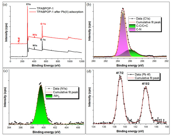 The XPS spectra of TPABPOP-1 and TPABPOP-1/Pb(II) are exhibited in Figure 4. It was seen that the XPS spectra of TPABPOP-1 exhibit two peaks at 284.86 and 399.52 eV attributed to carbon (C1s) and nitrogen (N1s), respectively [38]. Further, the O 1s peaks were observed as seen in Figure 4a, resulting from the physically adsorbed water or oxygen molecules which may be present in carbon-based materials. The same result was reported in a previous publication [39]. The deconvoluted N 1s spectrum shows one binding energy peak at 399.52 eV attributed to C–NH2 as shown in Figure 4b. The high-resolution XPS spectrum for C 1s displays two peaks at 284.76 and 285.98 eV for C–C/C=C and C–N, respectively (Figure 4c). In the XPS spectra of Pb(II)/TPABPOP-1 after adsorption, two new peaks appeared at 143.96 and 139.10 eV attributed to Pb 4f5/2 and Pb 4f7/2, respectively [40], demonstrating that Pb(II) ions were effectively absorbed by TPABPOP-1 (Figure 4d).