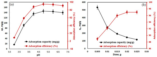 (a) Uptake capacity with respect to pH and (b) adsorbent dose.