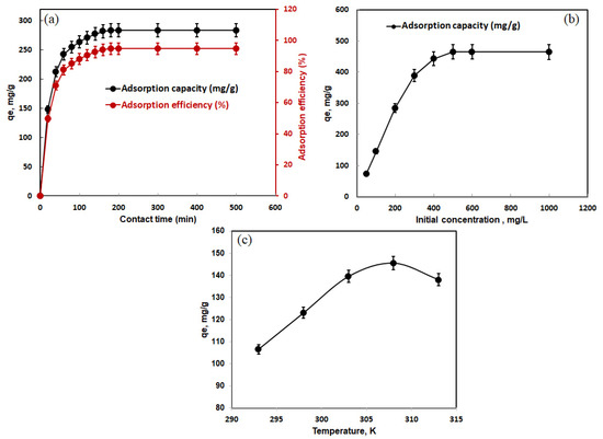 (a) Uptake capacity with respect to contact time, (b) Pb(II) concentration, and (c) temperature.