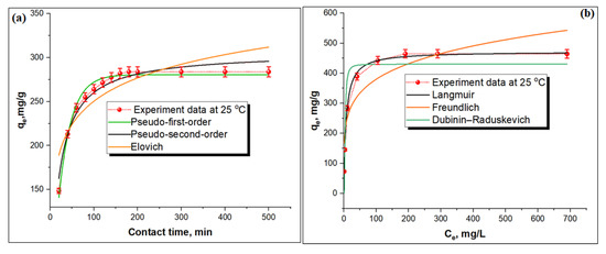 The influence of contact time on the adsorption interaction was achieved in the range 20–500 min under fixed conditions ([Pb]: 100 mg/L; pH: 5; mass: 0.02 g; and T: 298 K) as presented in Figure 6a. The Pb(II) ions displayed quick adsorption, as around 50% of adsorption took place in 20 min and increased to 94.6% within 180 min. Pb(II) adsorption efficiency onto TPABPOP-1 adsorbent is nearly stable after 180 min. This may be due to the availability of active adsorption sites onto the TPABPOP-1 adsorbent in the beginning stage [47,48]. After 180 min, there was no alteration in Pb(II) ion adsorption owing to the adsorption process reaching an equilibrium state. A similar trend for the influence of equilibrium time was reported for the adsorption of Pb(II) ions on a biomass–magnetic hybrid [49] and activated carbon [50].