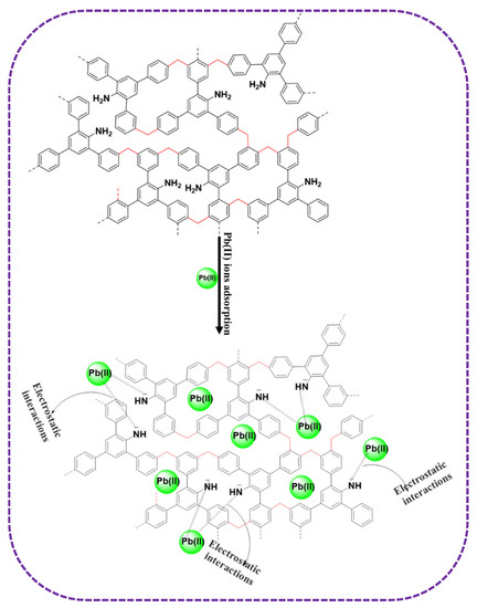 The mechanism of Pb(II) ion adsorption on TPABPOP-1 is presented in Figure 8. It was clear that the amino group is mainly responsible for Pb(II) ion adsorption as well as the uptake of Pb(II) by the porosity of TPABPOP-1 polymer. The mechanism of Pb(II) onto TPABPOP-1 was supported by FTIR spectra (Figure 3a), XPS analysis (Figure 4a), as well as pH factor. According to pH factor (Figure 3a), as the pH increases, and as the pH value rises from 2 to 5, the adsorption efficiency of TPABPOP-1 toward Pb(II) reached a maximum (97%), indicating that the amino groups of the TPABPOP-1 were deprotonated and the electrostatic interaction forces between Pb(II) and amino groups were created, which led to an improvement in the uptake capacity of TPABPOP-1. According to FTIR spectra (Figure 3a), the decrease in intensity and slight shift of NH2, N–H bending, and C–N bonds from 3423, 1622, and 1164 cm−1 to 3428, 1632, and 1150 cm−1, respectively, confirmed that the Pb(II) was successfully adsorbed onto the TPABPOP-1 adsorbent. The negative charge of the amino group of TPABPOP-1 polymer can easily attract the positively charged Pb(II) by the electrostatic interaction mechanism as displayed in Figure 8. Comparing the spectra of XPS before and after the uptake of Pb(II) on TPABPOP-1, a new peak assigned to Pb 4f appeared in the spectrum of TPABPOP-1. At the same time, two peaks at 139.10 and 143.96 eV ascribed to binding energies of Pb 4f7/2 and Pb 4f5/2, respectively, demonstrated that Pb(II) ions were effectively absorbed by TPABPOP-1.