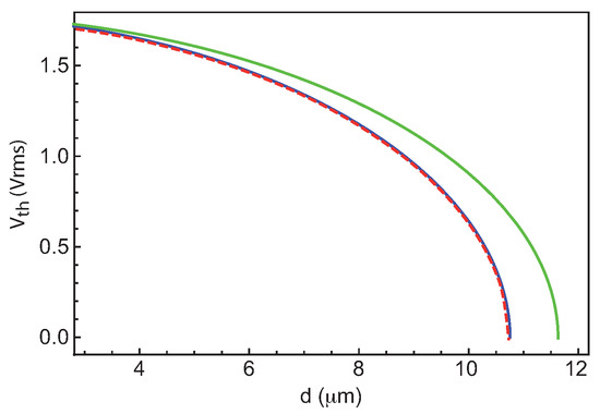 To test the accuracy of this prediction, we calculated the position of the tricritical point by solving numerically for each thickness Equations (8)–(10) in a small interval of voltages around . In the following, we will set and , with V (resp., ) the final (resp., initial) voltage in our simulations as described above. In our calculations, we took s m, s, , and large enough for the stationary regime to be reached. For the initial voltage, we took either or Vrms (Vrms). In the first case, the initial state is the HN, while in the second, the system transits through a high amplitude TIC before relaxing towards the steady state. In the following, all the curves calculated by taking will be drawn in blue, while those obtained by using V will be drawn in red.