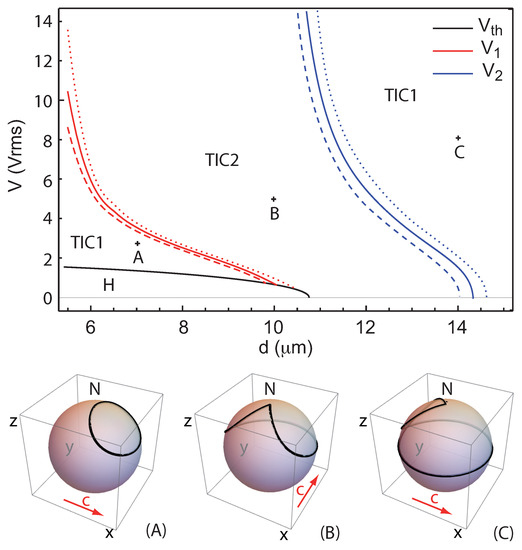 A detailed analysis of the transition between the TIC and HN structures (see Appendix B) suggests the existence of a first order transition between two TIC states, TIC1, oriented parallel to B and TIC2, oriented perpendicular to B. In this section, we will find the line of coexistence between these two TIC states, , and the associated spinodal lines and . The coexistence line intersects the spinodal curve of the HN at [], and the spinodal curves intersect the spinodal curve of the HN at [, and [, ], respectively. To this purpose, we solved for each thickness d the motion Equations (8)–(10) as a function of V by taking and or and we plotted to find the orientation of the TIC in the stationary regime. A few curves calculated at m are shown in Figure 3a. First, we observed that in all cases, tends either to (or ) or to , meaning that only solutions of type TIC1 or TIC2 are stable [Figure 3b]. Second, we observed that below the voltage Vrms, only a TIC1 develops, while above Vrms, only a TIC2 is present. On the other hand, the two TIC may be observed between these two limits, meaning that they are either stable or metastable in this interval. To find at which voltage the two solutions coexist, we calculated their energy and and solved the equation . At m, we found Vrms [Figure 3c]. Reproducing the same calculation at different thicknesses allowed us to plot in the phase diagram the coexistence curve (solid red line in Figure 4) and the two spinodal curves and (dashed and dotted red lines in Figure 4, respectively).