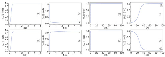 Angles and of a TIC1 (a–d) and a TIC2 (e–h) configuration in the middle of the sample as a function of time when the magnetic field is slightly tilted. (a,b,e,f) correspond to ; (c,d,g,h) correspond to .