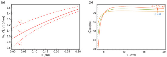 To complete this study, we investigated how the transition line and its spinodal limits and were modified when the magnetic field B is tilted from the horizontal. The result is shown in Figure 7a where we have plotted how , and change as a function of in a sample of thickness m. These curves show that, at constant B (here T), , and increase when increases. On the other hand, the hysteresis characterized by the difference decreases when increases. Finally, we show in Figure 7b how angle —which gives the orientation of the -director of TIC2—changes as a function of the applied voltage and tilt angle in a sample of thickness m. This figure shows that the larger the tilt angle , the further TIC2 is from being perpendicular to B, especially when the voltage is close to . A remarkable feature in this figure is that all the curves intersect at the same point. At this particular point corresponding to a voltage Vrms, TIC2 is perpendicular to B whatever the value of .