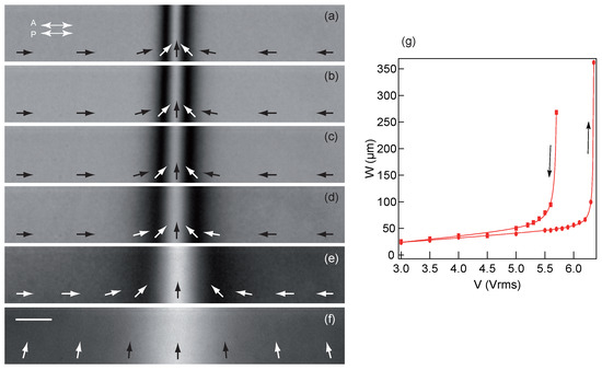 We first examine the behavior of the thinnest sample, of thickness m. A direct observation in the vicinity of the axis of the Halbach ring revealed that a wall systematically forms along the y-axis perpendicular to B when a large enough voltage is applied (see Figure 9a–e). This wall develops above the onset of instability of the TIC and separates two regions where the -director of the TIC is oriented in opposite directions. The formation of this wall was expected since the magnetic field lines are curved outside the magnet and are therefore slightly tilted with respect to the horizontal plane on either side of the wall in the sample. The formation of this wall thus confirms our theoretical prediction on the orientation of the TIC by a tilted magnetic field (see Section 2.4). We also noted that no other wall formed parallel to B, which clearly indicates that only one solution exists on either side of the wall. We are therefore dealing with a TIC1, in accordance with the phase diagram shown in Figure 4. Figure 9a–e shows images of this wall at different voltages when it is observed between polarizer and analyzer parallel to the x-axis (without the -wave plate). Under these optical conditions, we numerically checked using Jones calculus that between 2 and 7 Vrms the intensity transmitted through the TIC is minimal when its -director is close to 45 or 135 (mod. 180) from the x-axis. Consequently, the -director rotates by 90 between the two minima of the intensity profile, the distance of which defines the width W of the wall. Figure 9f shows how W varies as a function of V. It clearly appears that W diverges when the voltage reaches a value close to 6.4 Vrms. Above this value, the wall disappears, meaning that the TIC1 is transformed into a TIC2. Note that the -director of the TIC2 is strictly perpendicular to B only in the center of the sample where B is horizontal and turns to the right or to the left on either side of the center as predicted by our calculation because of the inclination of the magnetic field with respect to the horizontal (see Section 2.4). The approximate orientation of the -director deduced from the measurement of the local intensity between parallel polarizer and analyzer is indicated on each panel of Figure 9a–f. By decreasing the voltage, we observed that the wall reappears, but at a lower voltage, of the order of 5.6 Vrms, as shown in Figure 9g, where we also plotted W as a function of V at decreasing voltage. This behavior confirms the numerical observation that the TIC1->TIC2 transition has hysteresis. Note that these values are in rather good agreement with the values calculated above, which are Vrms (downwards ramp) and Vrms (upwards ramp).