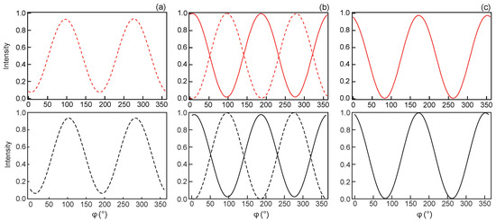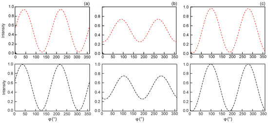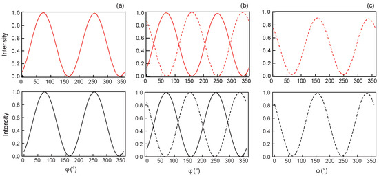 To confirm the existence of this orientation transition, we also measured the curve of transmitted intensity through the sample when the polarizer is parallel to the x-axis and the analyzer rotates by 360 starting from . Here, denotes the angle of the analyzer with the x-axis. For this measurement, performed with a m-thick sample, it was essential to add the quarter-wave plate to differentiate the two types of TIC. However, this optical measurement does not allow to determine in which direction each TIC is oriented, the intensity curves being invariant by the transformation . All measurements were performed inside a 50 × 50 m square whose center was slightly offset from the center of the wall to have a homogeneous intensity. A few curves are shown in Figure 10 and are compared to the theoretical curves calculated using Jones calculus and the numerical director field found by taking . In this figure, we note that, at 6 Vrms, the curve of TIC1 is observed during an upward voltage ramp while the curve of the TIC2 is observed when decreasing the voltage, again revealing that the transition does indeed have hysteresis. This figure shows that there is very good agreement between theory and experiment in this sample.