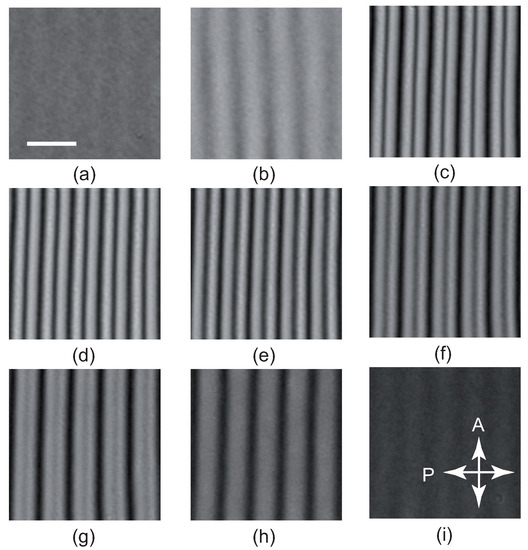 Cholesteric fingers of the first type (CF1) observed between crossed polarizer and analyzer in the m-thick sample by focusing on a dust particle inside the sample. From (a–i) V increases from 1.6 to 2.4 Vrms by increments of 0.1. The white bar is m long.