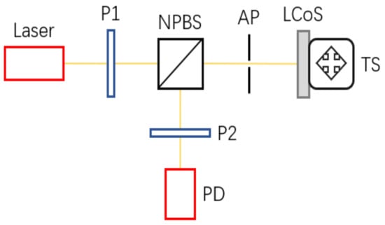 Considering the uncertain distortion from the NPBS, a quasi-perpendicular setup is preferred in the measuring process. After passing through polarizer P1 and aperture AP1, the laser beam is steered directly by the LCoS device through polarizer P2 and aperture AP2, and it is collected by the photo detector. Such a modified setup is demonstrated in Figure A3.