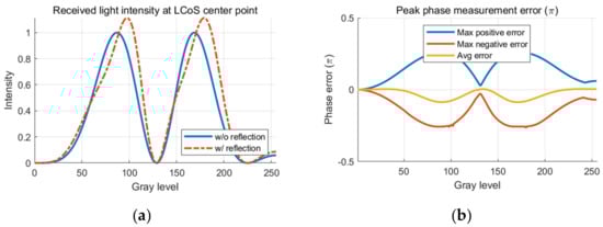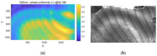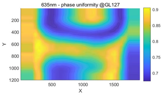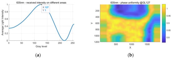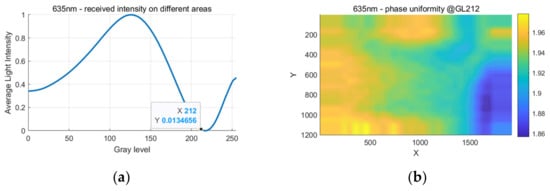 The phase error across the whole active area never reaches zero, as shown in Figure 6b, since the non-uniformity of the LC layer indicates that different areas would reach their error-free point of at different input gray levels, and there will always be some area with measurement error regardless of the gray level used.