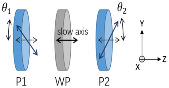 For the simplicity of the calculation again, the light intensity of the laser beam after polarizer P1 is marked as . When and are orthogonal to each other, which means , can be calculated as: