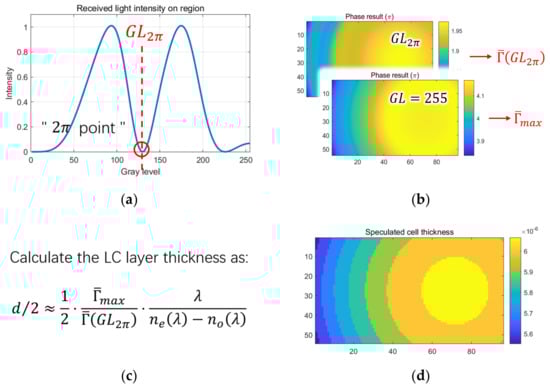 Since we have assumed that the phase retardation is only related to LC layer thickness, the thickness can be calculated by multiplying phase retardation by , and the final expression of LC layer thickness at this location can be written as: