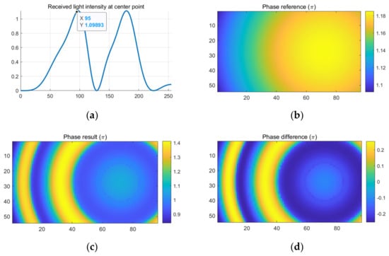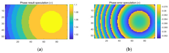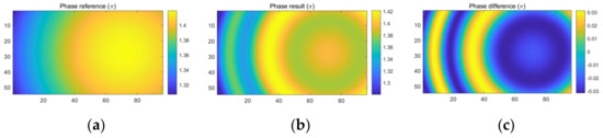 Meanwhile, Figure 11 demonstrates the simulated best-case scenario when and the measurement error are at the minimum, as indicated in Figure 11a. Compared to the real phase in Figure 11b, the measured phase distribution in Figure 11c shows only very little measurement error, which is around .