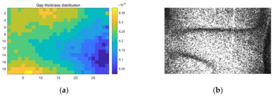For the actual measured data in real-life experiments, the LC thickness uniformity can be obtained based on Equation (22). Figure 15a shows the calculated LC layer thickness of this LCoS device indexed by subregions, and a clear saddle-shaped pattern can be seen. By comparing it to the interference pattern obtained on the same LCoS device shown in Figure 15b, obvious similarities can be seen, and the calculated thickness difference also matches the number of interference stripes, indicating the effectiveness of this method, which extracts the uniformity of the LCoS device.