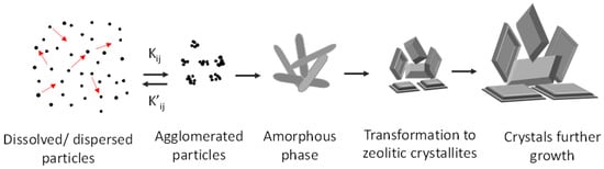 Nucleation is the first step of crystal formation that initiates by atoms accumulation in a small cluster inside the primary suspension. Dissolved species tend to form a quasi-solid phase, which is called nuclei, and likely contribute to the irreversible formation of the ultimate crystalline product through smart selections of crystallization conditions [,,,,]. It also indicates that inappropriate conditions can make this process reversible and the formed clusters can be redissolved in the mixture of precursors. The motive force, which is exerted on the suspended particles to begin the nucleation, is called supersaturation and acts as chemical potential between the dissolved species and consequently, forms a quasi-solid phase. In fact, the discrepancy between the actual concentration of zeolite precursors and the concentration at a solubility equilibrium at a certain temperature is known as supersaturation. As a possible effect, elevating the temperature can increase the entropy and chemical potential for a given synthetic system and, thus, facilitate the supersaturation condition in favor of the primary nucleation step []. However, it should be noted that increasing the temperature does not always positively affect the nucleation step and may suppress the nucleation by assisting the formation of different phases that are not thermodynamically desired for the nucleation step. In contrast, if the system shifts under supersaturation condition, clusters are dissolved in the primary solution []. Thermodynamically, two parameters govern how and at what speed the nucleation step is proceeding: (i) the difference in the total free energy of the system between the two final states (i.e., dissolved particles as State 1 and formed cluster as State 2, which is known as a bulk term; and (ii) the interaction between the solid centers and suspension phase at the interfaces, which is known as a surface term []. By realizing this, the nucleation rate can be altered by setting the supersaturation condition, indicating the higher the supersaturation, the faster the rate of nucleation, and the smaller the crystal size distribution. There is a threshold amount for supersaturation (i.e., so-called critical supersaturation zone, also characterized as the meta-stable zone); This is a region which above it, the nucleation occurs exponentially [], yet, very close to this region, the crystal growth dominates the negligible nucleation and only a few large crystals are formed. In other words, when the system shifts to a critical supersaturation condition, nucleation occurs in a short time and stops quickly because the process reaches a phase that is incapable of forming crystals [,]. Furthermore, in the critical supersaturation region, the formed nuclei possess a critical radius which below this radius nuclei dissolve; in contrast, above it, nuclei can reduce the formation Gibbs energy and further grow []. The primary nucleation classically occurs via two different pathways: (i) homogeneous nucleation in a pure phase, which uniformly grows from the parent phase via local fluctuations; or (ii) heterogeneous nucleation at low supersaturation, which occurs by adding seeds or in general in the presence of impurities [,,,]. However, both types of nucleation assists lowering the surface energy to the possible negative value []. Despite these routes and regardless of which one is the cause of primary nucleation, secondary nucleation is the result of several dynamic interplays in the nucleating medium as well as surface interactions eventuating in polycrystalline breeding. For instance, the separation of extremely small particles from the surface of clusters or crystals, due to the collision of particles, abrasion, or shear stress, is a known factor causing the second nucleation step []. The mechanism of nucleation and the different steps that happen in the course of time are represented in Figure 1. By inversing conditions, redispersion occurs and agglomerates are dissolved in the solution. The primitive particles that are initially formed in the basic medium construct a primary amorphous phase; however, over time, the secondary amorphous phase is formed, which is characterized by short-range orders. Due to this new ordering, this phase is different from the primary amorphous phase. By aging and heating under autogenous pressure, secondary phase is gradually rearranged and further grow with a repetitive order and is finally transformed into crystalline zeolite particles.