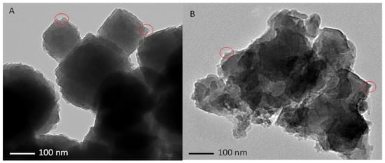 TEM image of (A) zeolite Beta and (B) zeolite Y crystalline particles. Two edges of crystallites with morphological dislocation are shown with red circles.