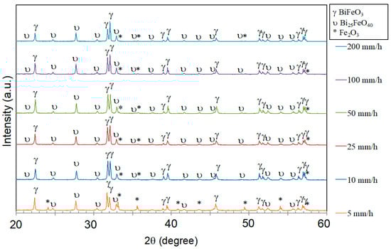 Figure 1 depicts the room temperature XRD fiber patterns grown by the LFZ technique with a different growth rate, and the results show that all samples have three crystalline phases: BiFeO3, Bi25FeO40, and Fe2O3.